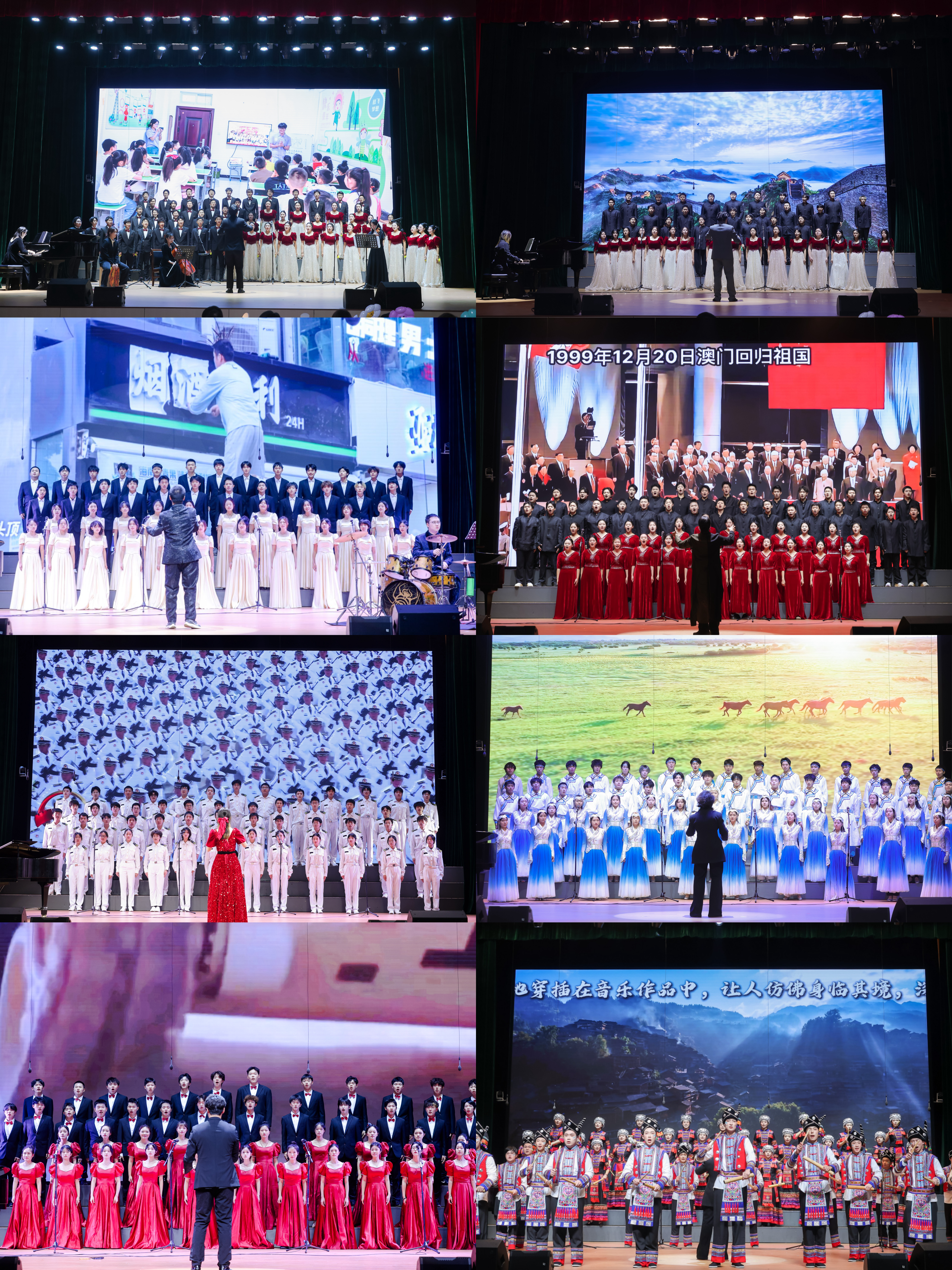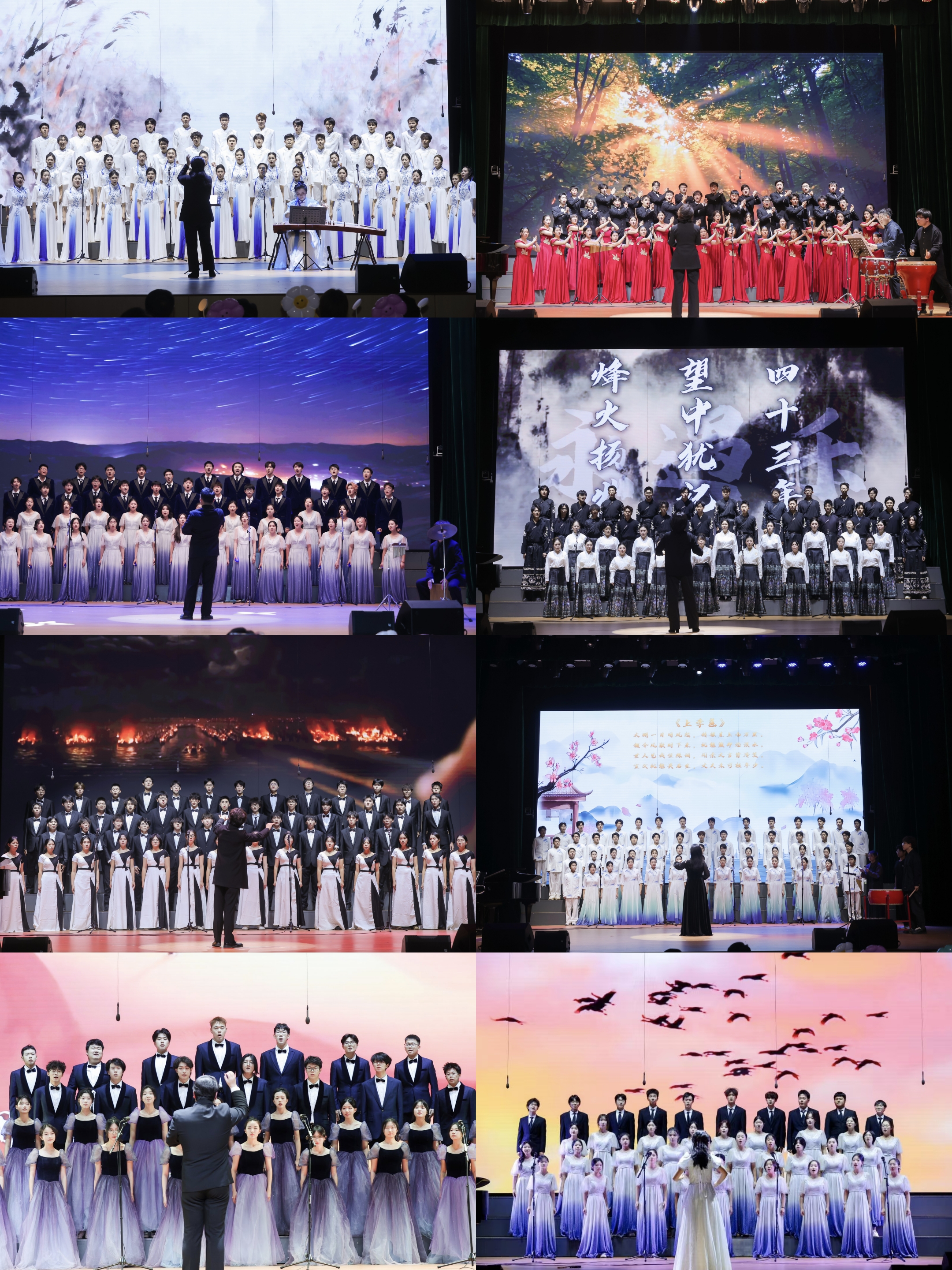 资环学院“资环之声合唱团”以《如愿》咏志,敬先辈初心,抒家国深情;信息学院“翩羽合唱团”《再回首》以旧韵织新章,尽显青春底气;计算机智能学院“晨曦合唱团”一首《无名的人》用温情旋律,定格校园里的每份善意微光;自动化学院“青禾合唱团”演绎《龙的传人》以华夏文脉立根铸魂,彰显民族昂扬底气;航运学院“远航合唱团”带来《当那一天来临》用歌致敬峥嵘岁月,抒怀向海凌云壮志;数统学院“617合唱团”一首《敕勒川》乐韵与和音交织,展草原苍莽辽阔和牧民豪迈风骨;物理与力学学院“黎响合唱团”一曲《在灿烂的阳光下》以暖律和声,绘就生活繁荣兴盛之美景;化生学院“风华合唱团”的《山寨猎歌》融基诺族古韵,传唱民族文化和初心。