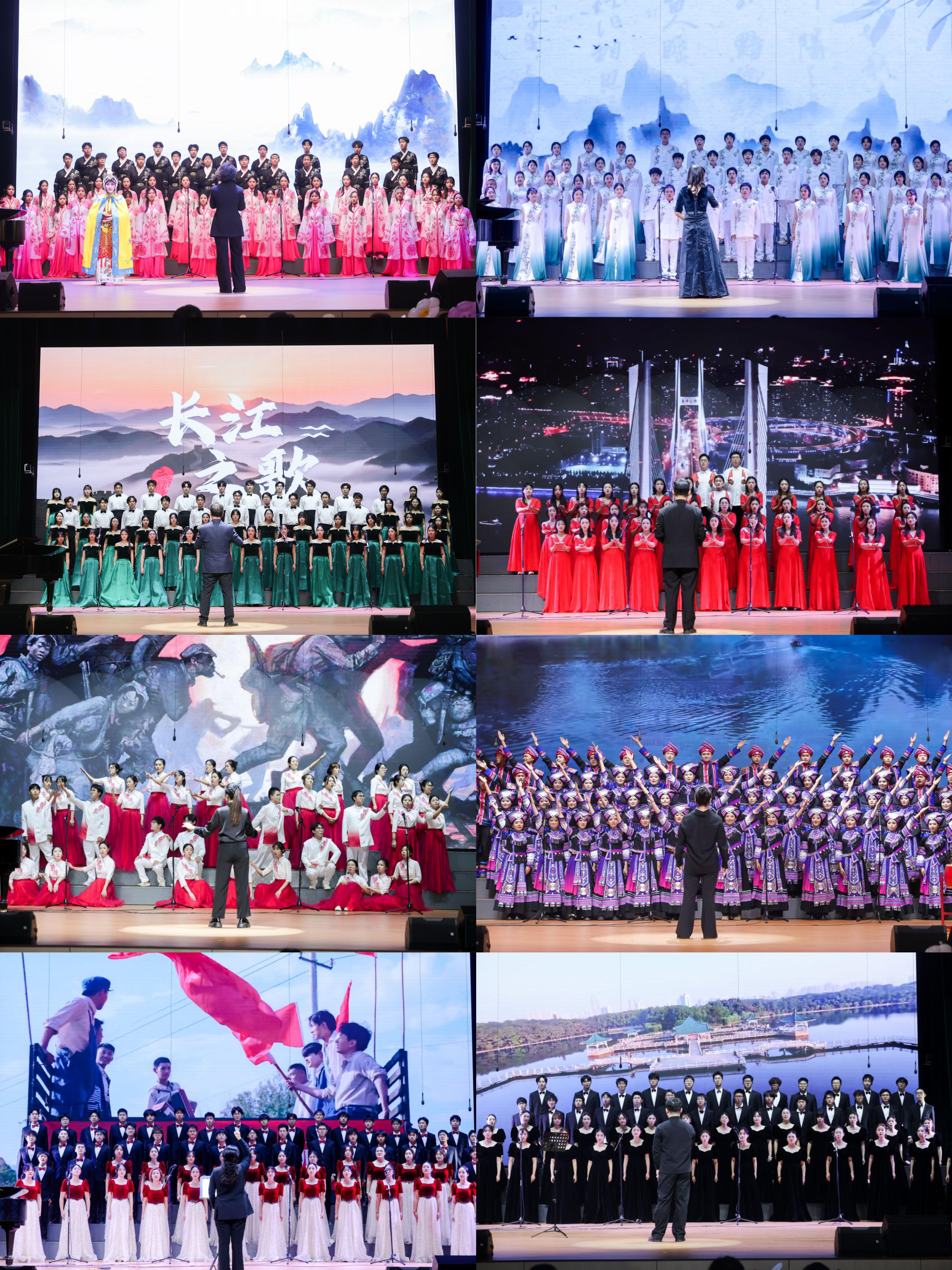 管理学院“飞鸿合唱团”一曲《月色清明舞婆娑》借诗戏雅韵勾勒古境,显灵秀风姿;经济学院“晨曦合唱团”《越人歌》依楚辞诉跨时空情愫,引发深层共鸣;艺设学院“沐光合唱团”献上《长江之歌》借激昂旋律,赞颂母亲河的壮阔;外语学院“We sing合唱团”一首《灯火里的中国》用温润声线勾勒盛景,谱写时代新篇;马克思主义学院“星火合唱团”吟《十送红军》赤色骊歌,续军民鱼水深情;法学社会学院“薪火合唱团”《大地飞歌·三月三》以铜鼓伴清吟,鲜活壮乡风韵;安全应急学院“赤子心合唱团”一曲《追寻》以旋律铸信念,彰显青年热忱;国教学院“浩瀚合唱团”《汉阳门花园》以武汉方言吟市井烟火,诉游子乡愁;厚德书院“闪亮合唱团”一曲《世界赠与我的》拾城隅暖意,吟唱岁月馈赠的温柔。