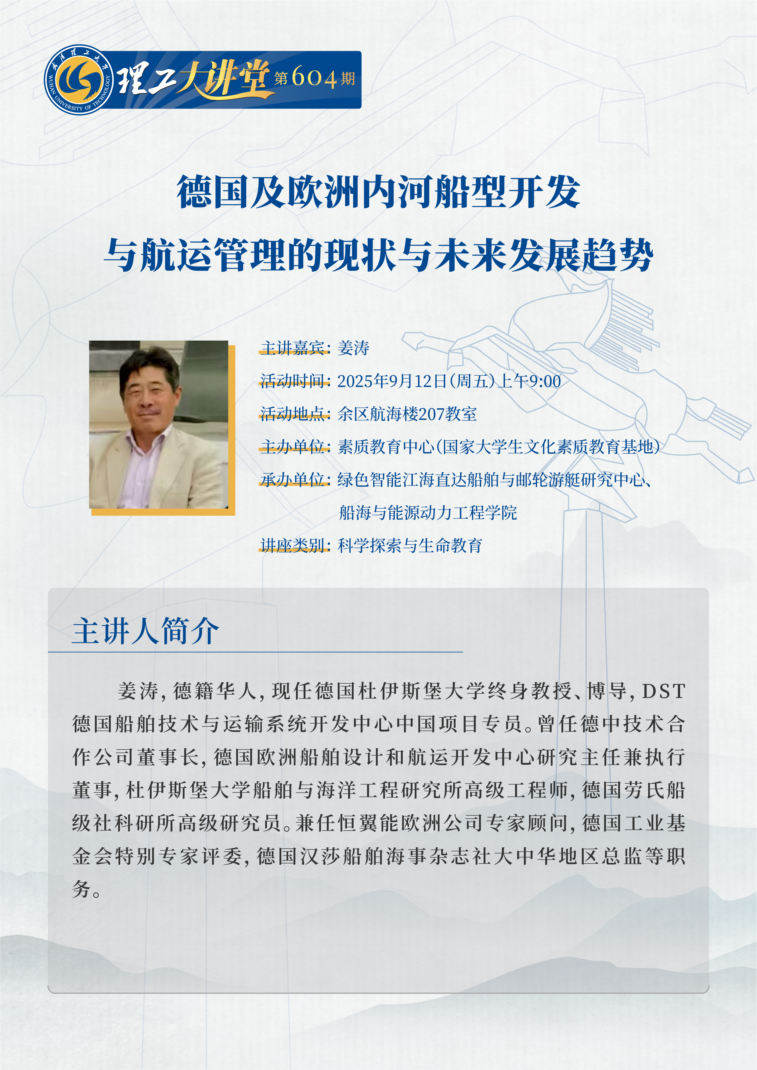 本次活动由绿色智能江海直达船舶与邮轮游艇研究中心、船海与能源动力工程学院承办,欢迎广大师生踊跃参与。
