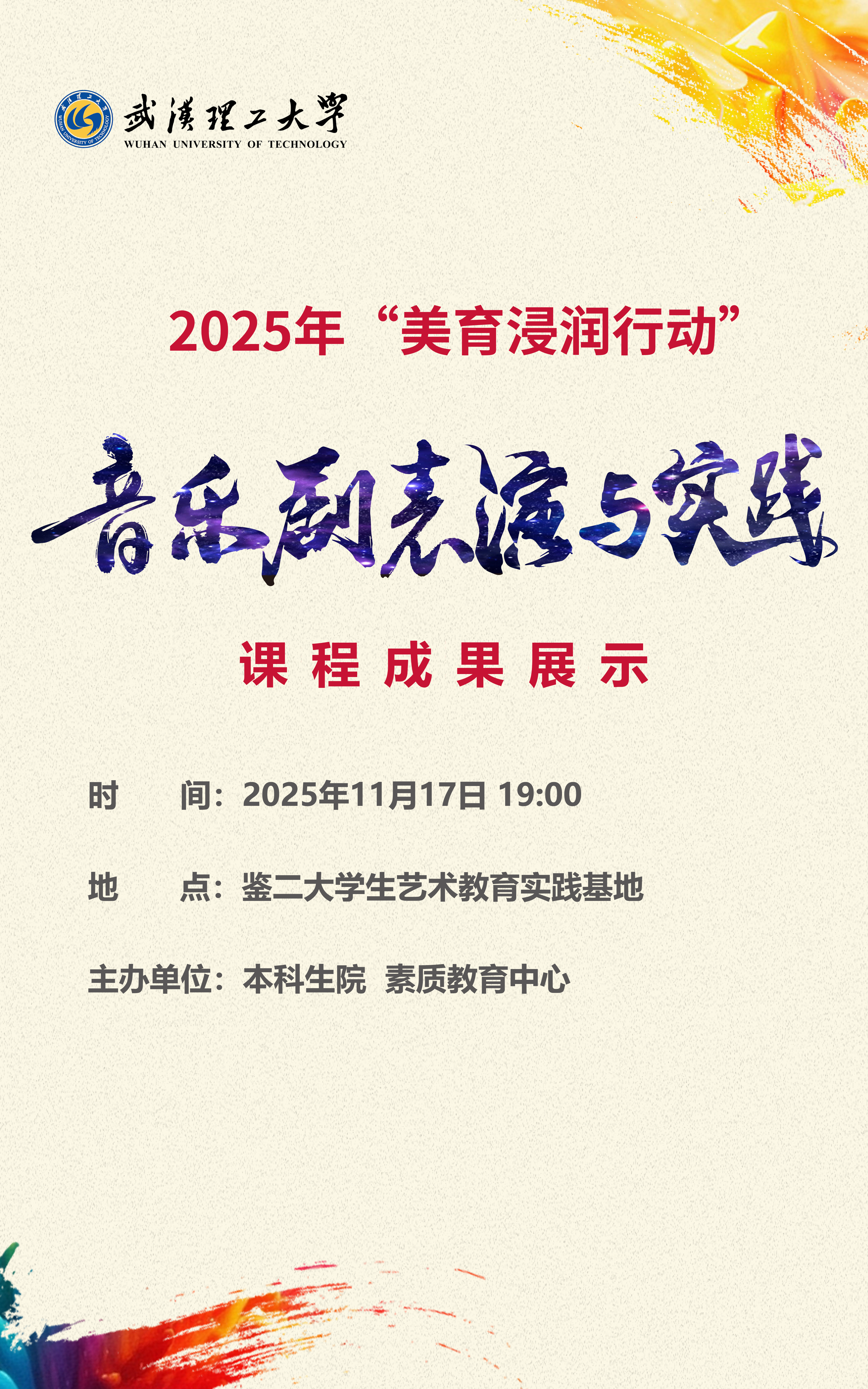 2025年“美育浸润行动”音乐剧表演与实践课程成果展示于11月17日(周一)19:00在鉴二大学生艺术教育实践基地举行,欢迎广大师生前往观看。