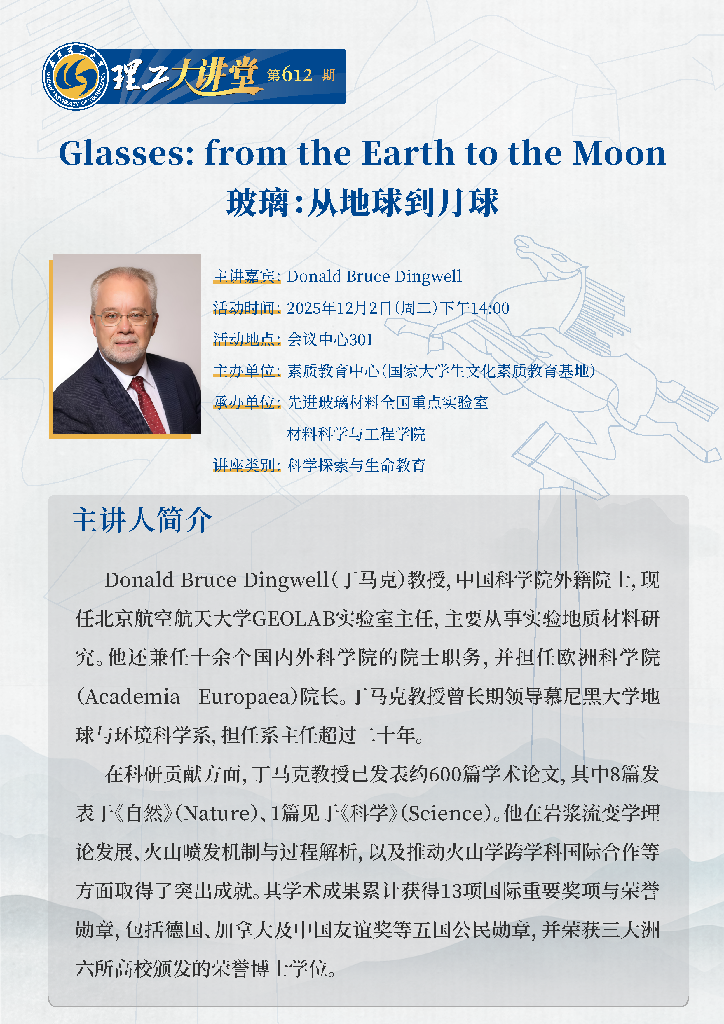 本次活动由先进玻璃材料全国重点实验室、材料科学与工程学院承办,欢迎广大师生踊跃参与。