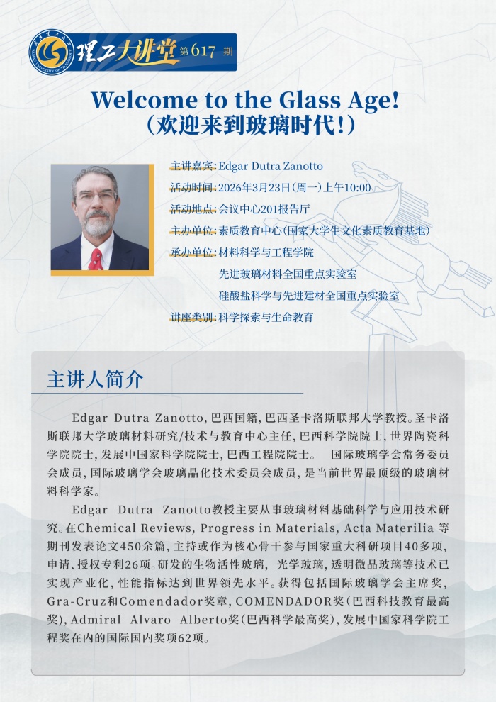 本次活动由材料科学与工程学院、先进玻璃材料全国重点实验室、硅酸盐科学与先进建材全国重点实验室承办,欢迎广大师生踊跃参与。